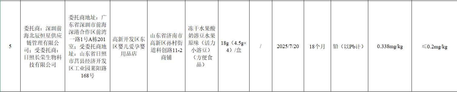 按照传递内容,济南市高新开辟区东区婴儿爱孕婴用品店发卖的、标称广东省深圳前海北辰恒星供应链办理无限公司委托日照长荣生物科技无限公司出产的冻干生果酸奶溶豆生果原味(便利食物),此中铅(以Pb计)查验值不合适相关产物施行尺度要求。